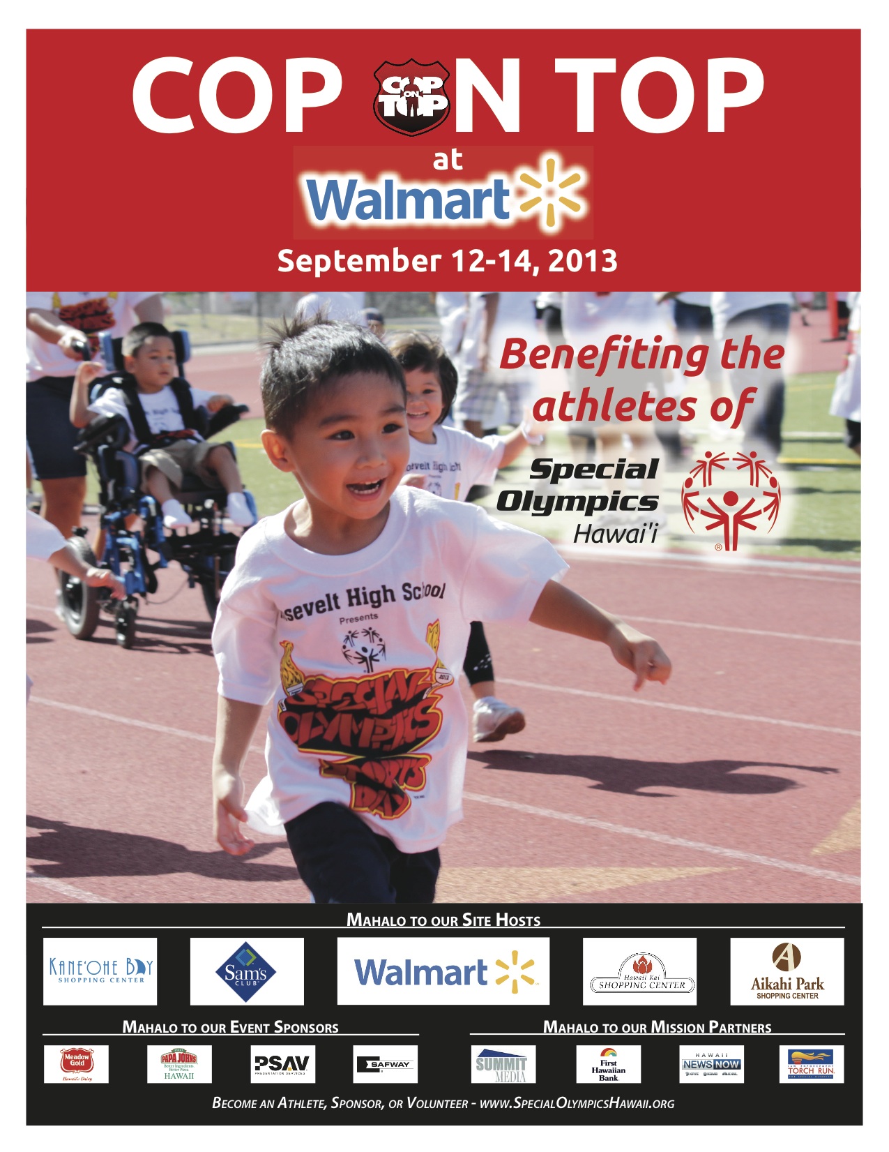 Special Olympics Hawaii is gearing up for their 12th annual Cop-On-Top fundraising event which will be held September 12-14, 2013. Federal, State, and City Law Enforcement Agencies will be volunteering their time to “sit on top” a 20-foot tall scaffolding at Sam’s Club Pearl City for 3 days!